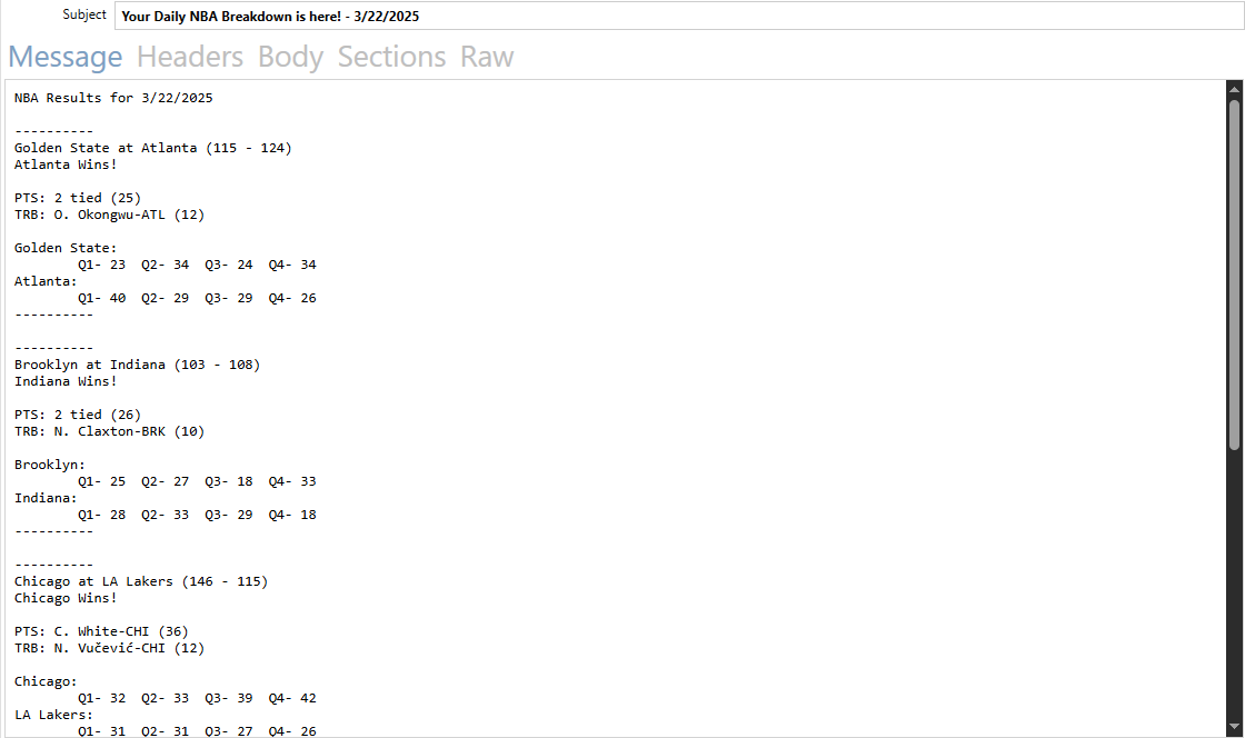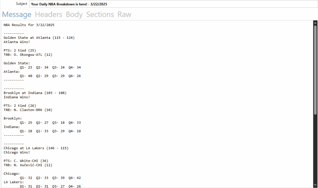 A Windows service that runs in the background, scrapes basketball game results from https://www.basketball-reference.com/boxscores once a day, then sends that information in an email via SMTP.