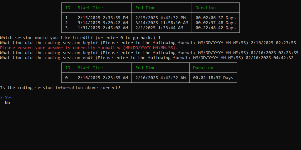 - new coding session entries and view, edit, and delete existing ones.