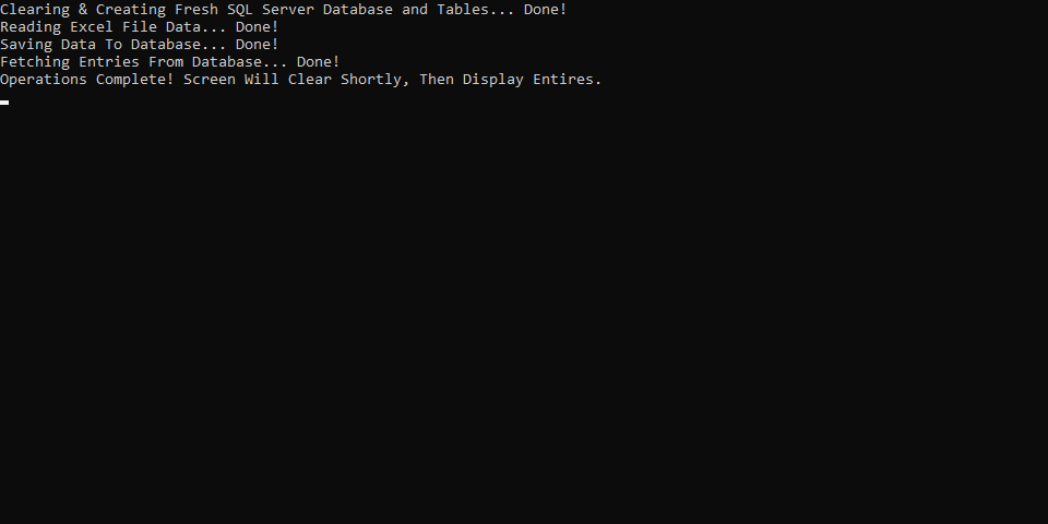 - Deletes and Re-creates the Database and it’s tables every time the application runs to ensure no outdated records from previous Excel documents.