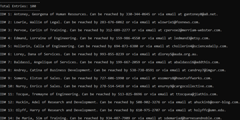 - Fetches business information saved in an Excel document (Existing Id Number, First and Last Name, Email, Phone, and Department Name) using EPPlus to extract data.