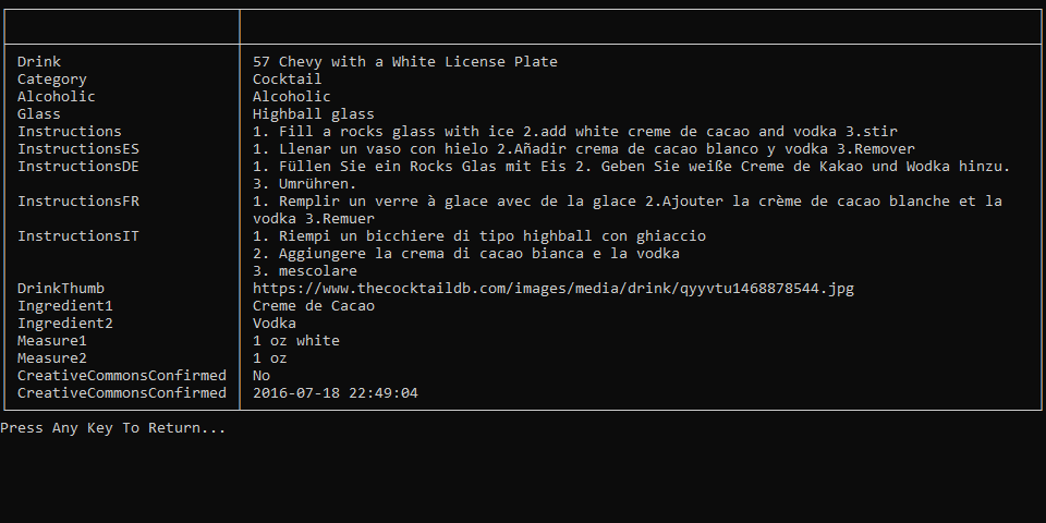 A console application that allows the user to access drink recipes from TheCocktailDB.com!