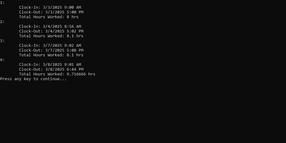 A console application that allows a user to manage and track their working hours. Also included is a locally run API to interface with a SQL Server containing work shift records.